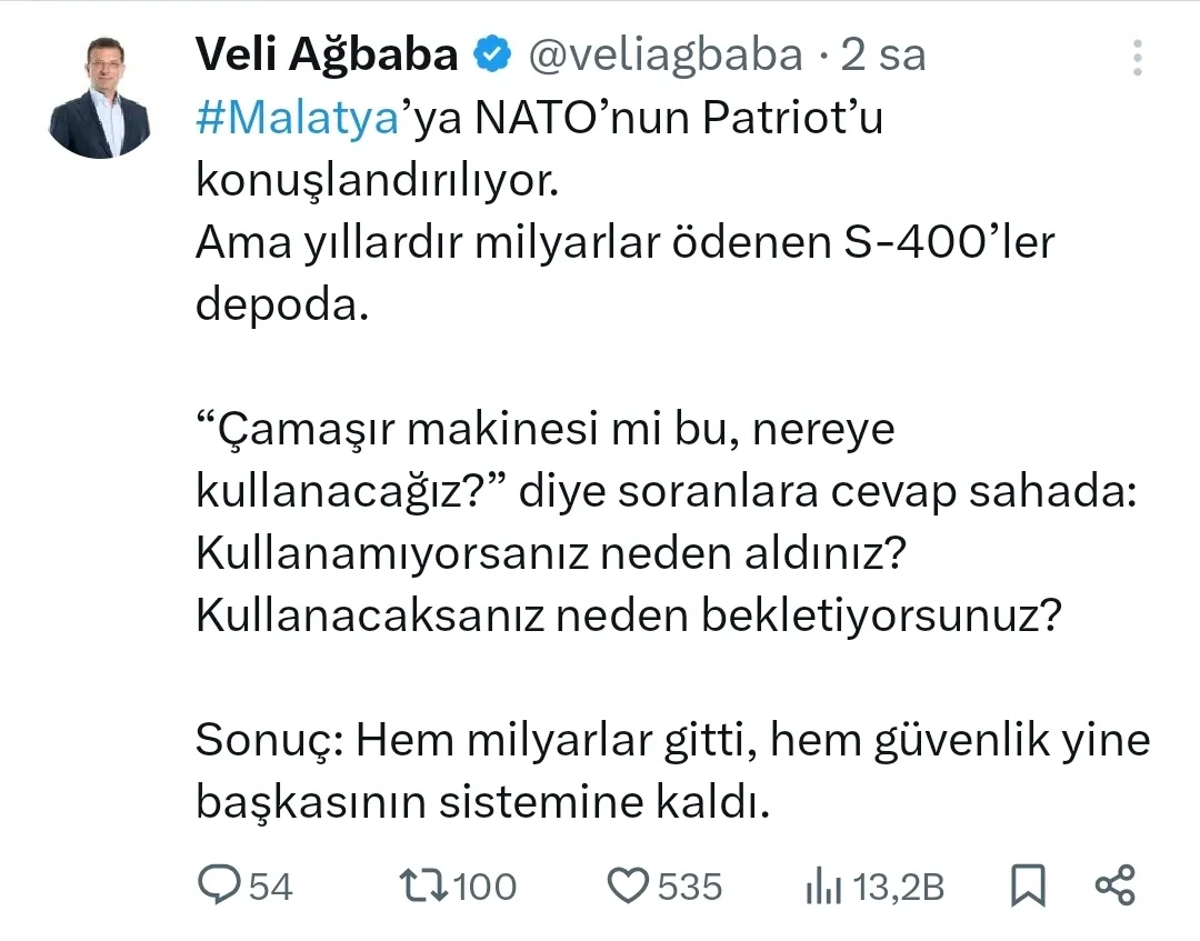 Paylaşımında, daha önce S-400’lerin kullanımına yönelik yöneltilen “Çamaşır makinesi mi bu, nereye kullanacağız?” sorusuna atıfta bulunan Ağbaba, “Kullanamıyorsanız neden aldınız? Kullanacaksanız neden bekletiyorsunuz?” ifadelerini kullandı.