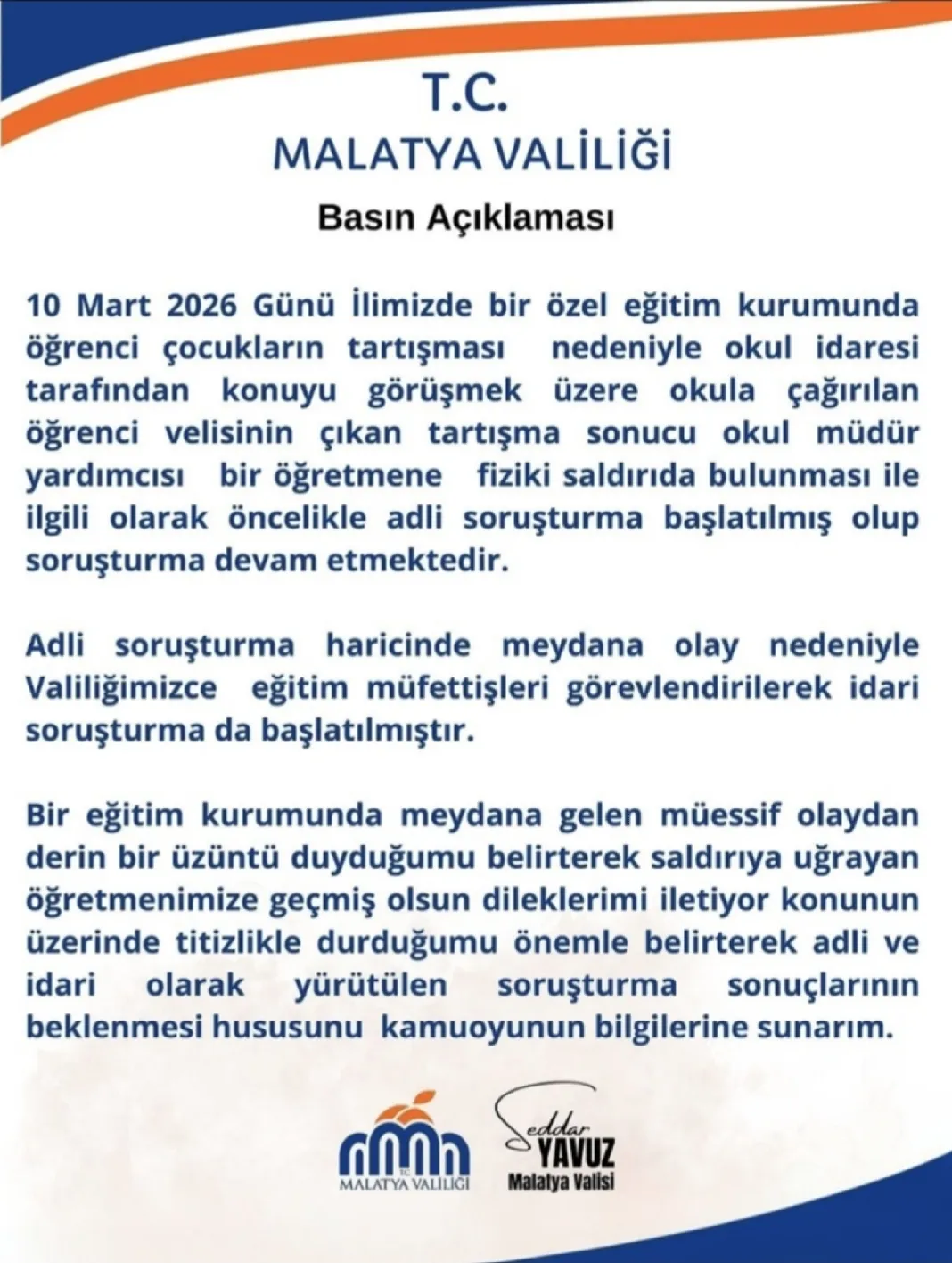 Malatya Valiliği, 10 Mart 2026 tarihinde kentte bulunan bir özel eğitim kurumunda yaşanan fiziki saldırı olayıyla ilgili kamuoyuna açıklamada bulundu.